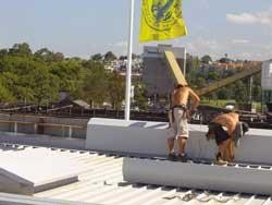 137 smoke stacks on the roof proved to be a ready source of numerous serious leaks in particular rain/wind conditions. These were sealed byway of rapid curing class 111 latex membrane (Flowthane) impregnated with polypropylene fibres prior to been coated with the top coat membranes and urethane sealants. Over 500 metres of parapet wall cappings were removed and replaced with new colorbond metal capping. Numerous mobile phone towers were repaired with new flashings and decktites as the existing ones had perished from the continued exposure to water and bird droppings.